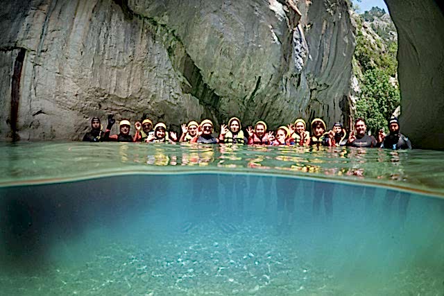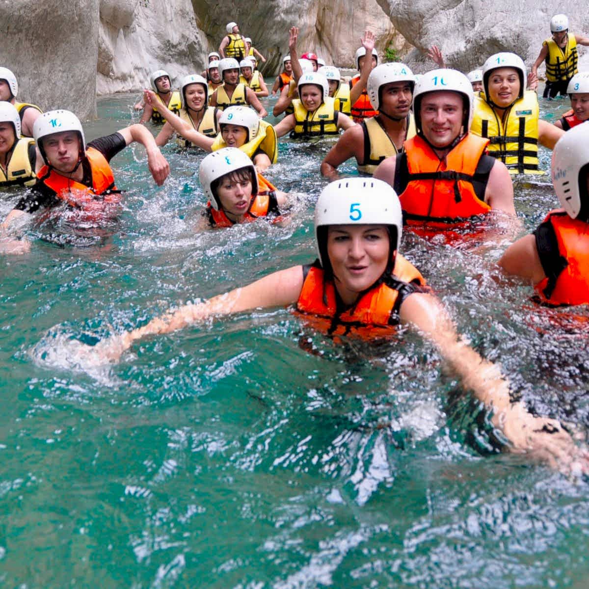 Kanyondan çıkan katılımcılar kısa mesafedeki rafting turunun başlama noktasına kadar yüzerler ve ufak bir dinlenme molasından sonra burada kendilerini hazır bekleyen botlarına binerek dalgaların arasına karışırlar.